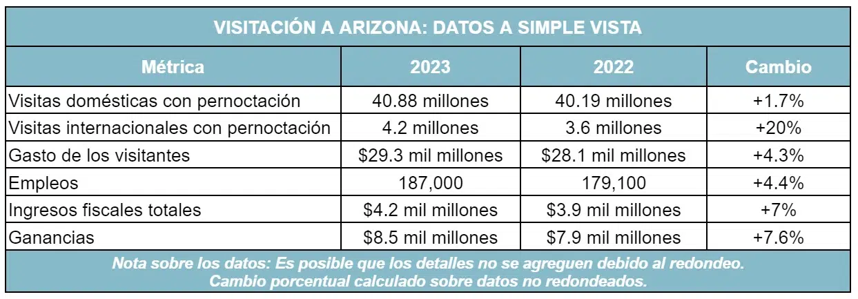 En 2023, la industria del turismo de Arizona logró un crecimiento interanual en todos los ámbitos, incluido un aumento del 1.7% en las visitas, un aumento del 4.3% en el gasto de los visitantes y un aumento del 4.4% en los empleos turísticos. Esto incluye el hospedaje de casi 41 millones de visitantes nacionales y 4.32 millones de visitantes internacionales que pernoctan y gastaron $29.3 mil millones en las más de 90 ciudades, pueblos y comunidades de Arizona, lo que equivale a $80 millones gastados cada día aquí.